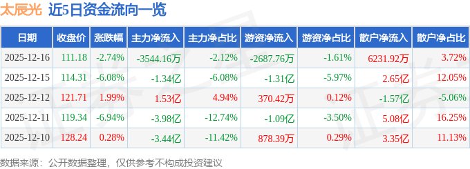 证券之星消息,截至2025年12月16日收盘,太辰光(300570)报收于111.18元,下跌2.74%,换手率7.7%,成交量14.8万手,成交额16.73亿元。