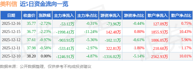 证券之星消息,截至2025年12月16日收盘,美利信(301307)报收于35.77元,下跌2.72%,换手率4.3%,成交量4.69万手,成交额1.69亿元。