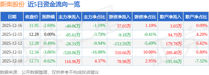 证券之星消息,截至2025年12月16日收盘,新柴股份(301032)报收于11.95元,下跌2.69%,换手率1.75%,成交量2.8万手,成交额3371.14万元。