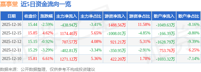 证券之星消息,截至2025年12月16日收盘,嘉事堂(002462)报收于15.44元,下跌2.59%,换手率2.84%,成交量8.26万手,成交额1.29亿元。