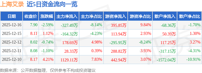 12月16日的资金流向数据方面,主力资金净流出327.49万元,占总成交额8.14%,游资资金净流入395.85万元,占总成交额9.84%,散户资金净流出68.36万元,占总成交额1.7%。