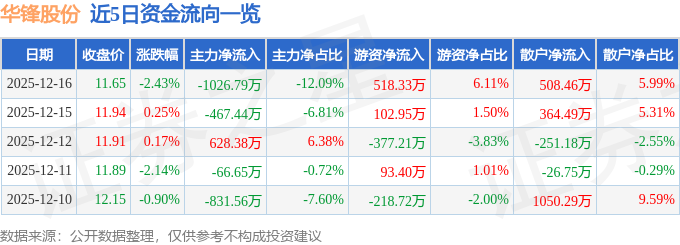 证券之星消息,截至2025年12月16日收盘,华锋股份(002806)报收于11.65元,下跌2.43%,换手率4.16%,成交量7.24万手,成交额8490.24万元。