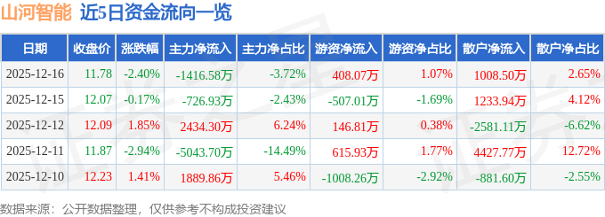 证券之星消息,截至2025年12月16日收盘,山河智能(002097)报收于11.78元,下跌2.4%,换手率3.02%,成交量32.42万手,成交额3.81亿元。