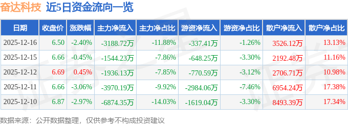 证券之星消息,截至2025年12月16日收盘,奋达科技(002681)报收于6.5元,下跌2.4%,换手率2.66%,成交量40.81万手,成交额2.69亿元。