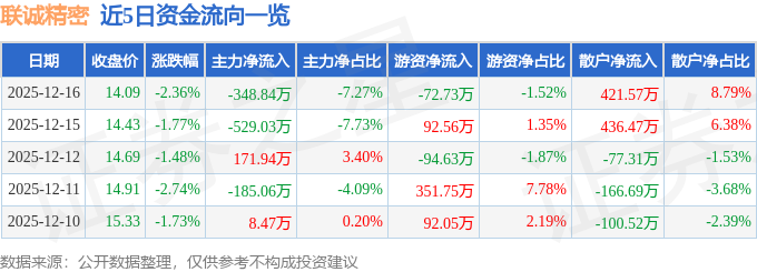 证券之星消息,截至2025年12月16日收盘,联诚精密(002921)报收于14.09元,下跌2.36%,换手率2.63%,成交量3.37万手,成交额4796.71万元。
