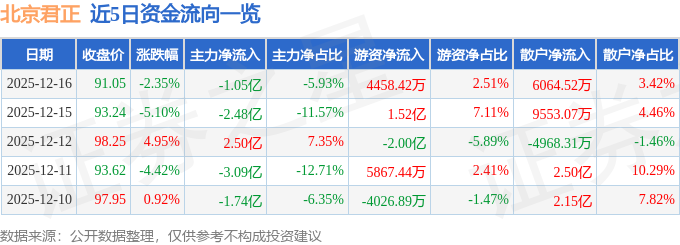 证券之星消息,截至2025年12月16日收盘,北京君正(300223)报收于91.05元,下跌2.35%,换手率4.54%,成交量19.1万手,成交额17.74亿元。