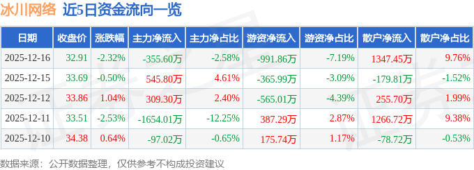 证券之星消息,截至2025年12月16日收盘,冰川网络(300533)报收于32.91元,下跌2.32%,换手率2.53%,成交量4.17万手,成交额1.38亿元。