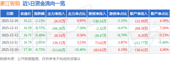 证券之星消息,截至2025年12月16日收盘,豪江智能(301320)报收于16.22元,下跌2.23%,换手率2.52%,成交量1.72万手,成交额2787.59万元。