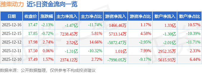 证券之星消息,截至2025年12月16日收盘,潍柴动力(000338)报收于17.47元,下跌2.13%,换手率1.44%,成交量71.98万手,成交额12.54亿元。