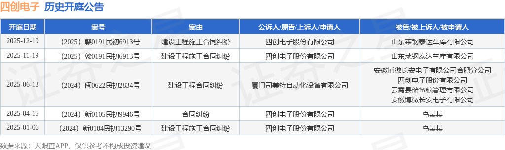 案号:(2025)赣0191民初6913号根据统计,近一年内以四创电子股份有限公司为当事人的历史开庭公告有5则,其中案由为“建设工程施工合同纠纷”的公告以3则居首,其次为“合同纠纷”有1则,“建设工程合同纠纷”有1则。历史开庭公告如下: