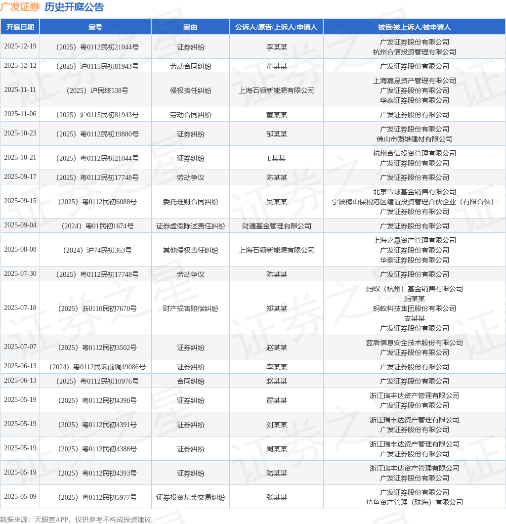 案号:(2025)粤0112民初21044号根据统计,近一年内以广发证券股份有限公司为当事人的历史开庭公告有43则,其中案由为“证券纠纷”的公告以15则居首,其次为“证券投资基金交易纠纷”有7则,“证券虚假陈述责任纠纷”有4则。历史开庭公告(前20条)如下: