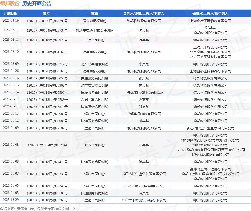 案号:(2025)沪0118民初21457号根据统计,近一年内以德邦物流股份有限公司为当事人的历史开庭公告有387则,其中案由为“快递服务合同纠纷”的公告以115则居首,其次为“运输合同纠纷”有78则,“劳动争议”有29则。历史开庭公告(前20条)如下: