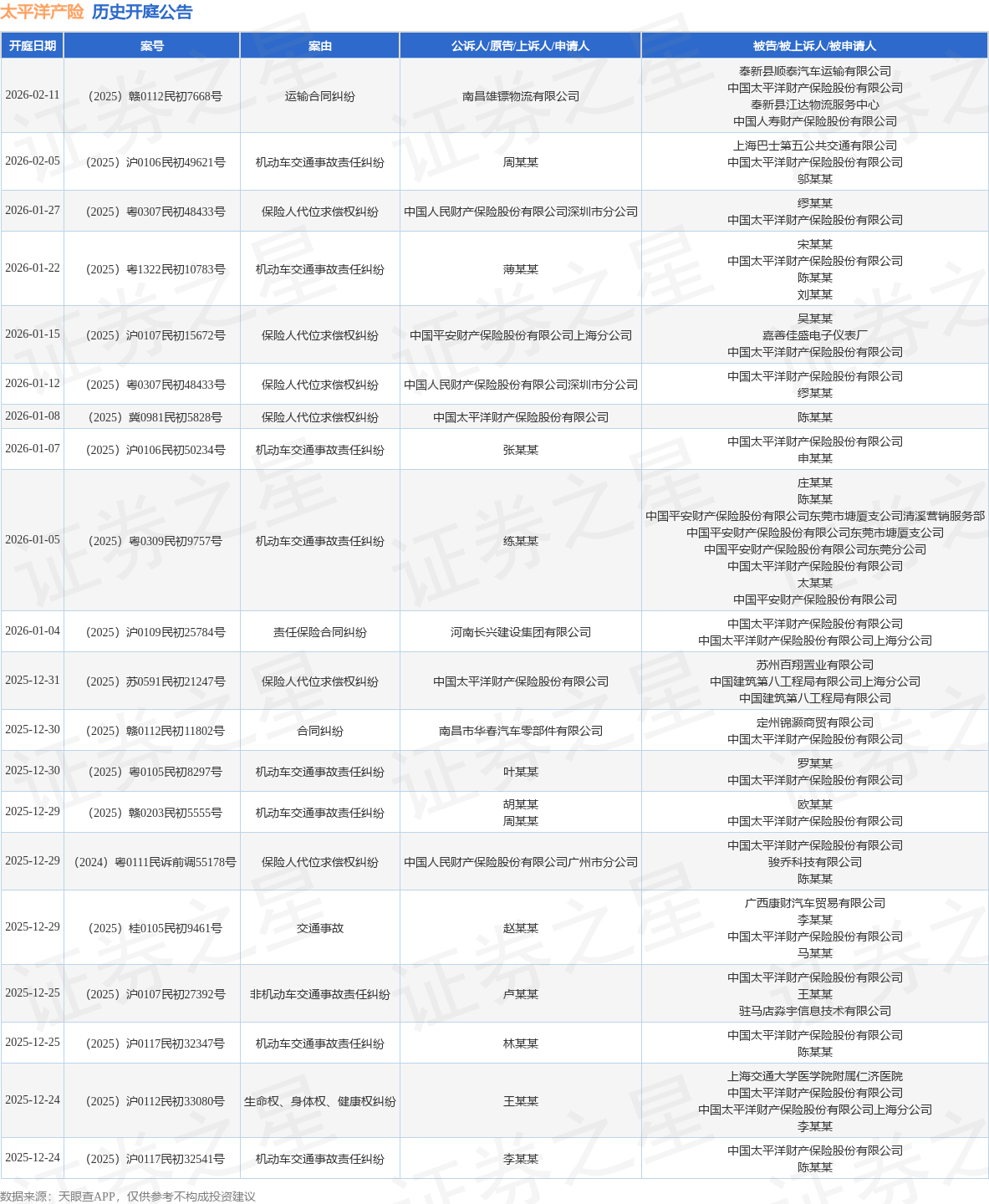 案号:(2025)闽0426民初3716号根据统计,近一年内以中国太平洋财产保险股份有限公司为当事人的历史开庭公告有701则,其中案由为“机动车交通事故责任纠纷”的公告以456则居首,其次为“保险人代位求偿权纠纷”有79则,“非机动车交通事故责任纠纷”有28则。历史开庭公告(前20条)如下: