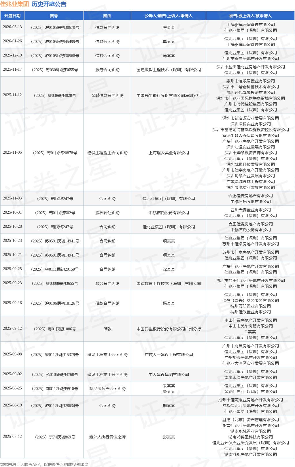 案号:(2025)沪0105民初30568号根据统计,近一年内以佳兆业集团(深圳)有限公司为当事人的历史开庭公告有99则,其中案由为“合同纠纷”的公告以19则居首,其次为“建设工程施工合同纠纷”有16则,“商品房预售合同纠纷”有15则。历史开庭公告(前20条)如下: