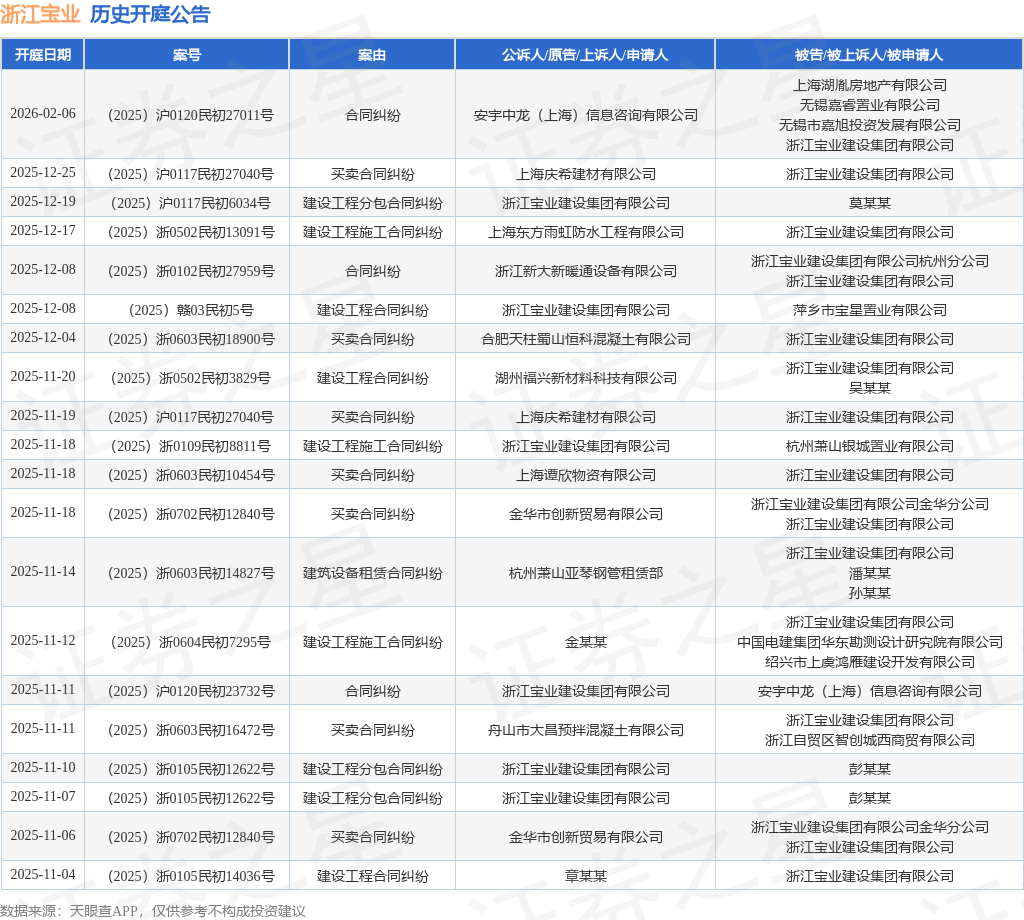 案号:(2025)浙0502民初13091号根据统计,近一年内以浙江宝业建设集团有限公司为当事人的历史开庭公告有162则,其中案由为“建设工程施工合同纠纷”的公告以43则居首,其次为“买卖合同纠纷”有37则,“建设工程分包合同纠纷”有24则。历史开庭公告(前20条)如下: