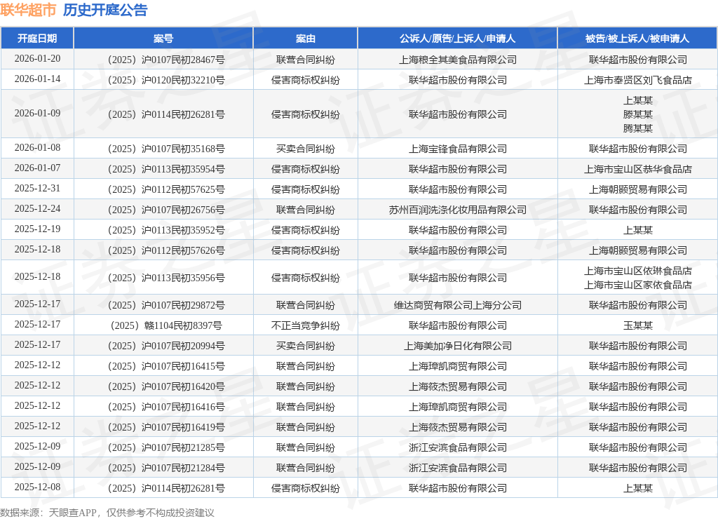 案号:(2025)沪0113民初35952号根据统计,近一年内以联华超市股份有限公司为当事人的历史开庭公告有128则,其中案由为“侵害商标权纠纷”的公告以67则居首,其次为“联营合同纠纷”有17则,“买卖合同纠纷”有13则。历史开庭公告(前20条)如下: