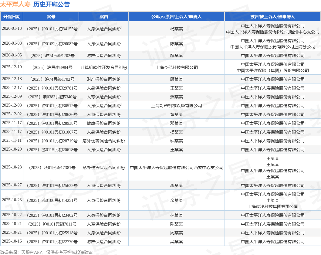 案号:(2025)沪民申3984号根据统计,近一年内以中国太平洋人寿保险股份有限公司为当事人的历史开庭公告有143则,其中案由为“人身保险合同纠纷”的公告以91则居首,其次为“意外伤害保险合同纠纷”有14则,“保险纠纷”有12则。历史开庭公告(前20条)如下: