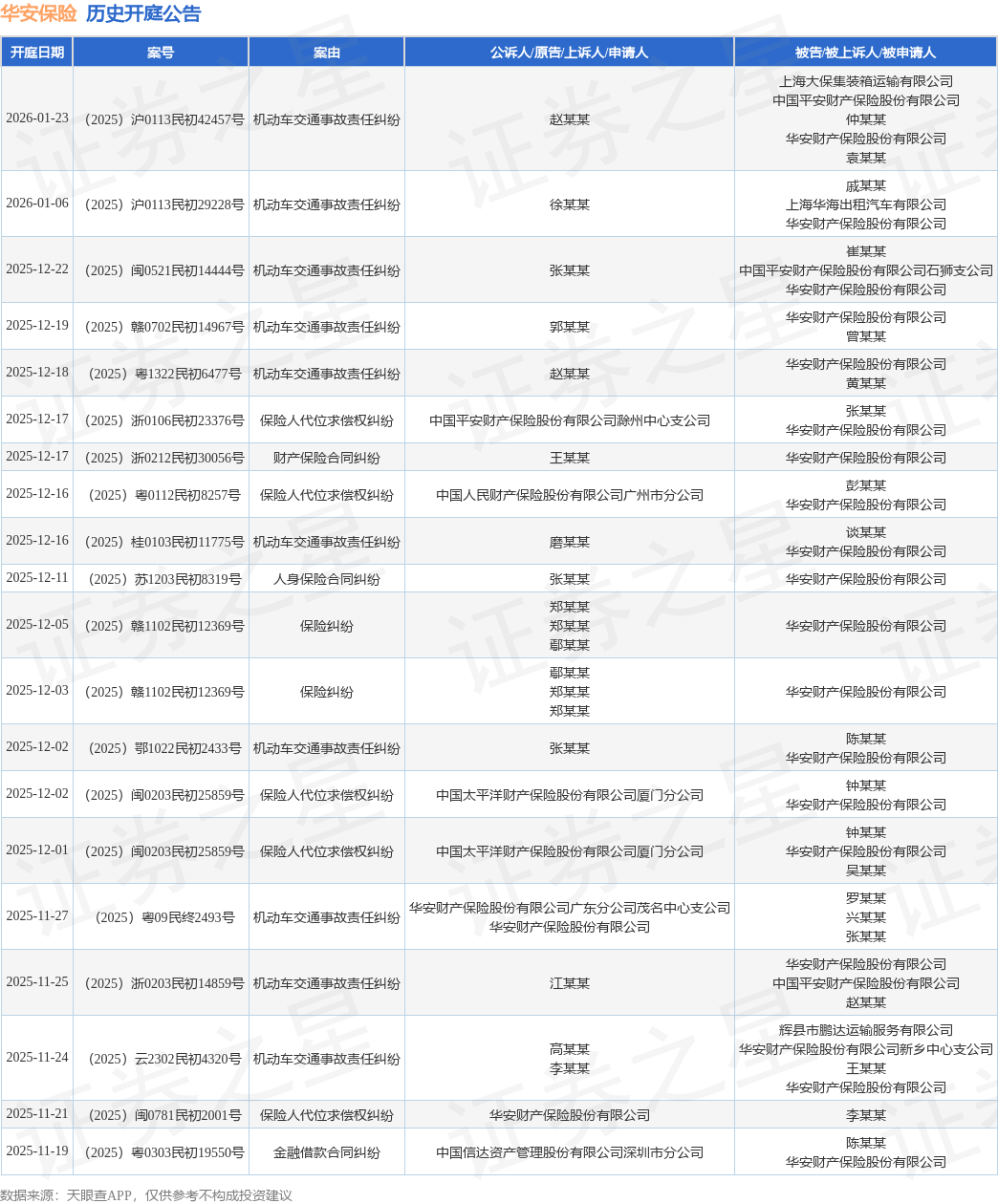 案号:(2025)浙0106民初23376号根据统计,近一年内以华安财产保险股份有限公司为当事人的历史开庭公告有228则,其中案由为“机动车交通事故责任纠纷”的公告以125则居首,其次为“保险人代位求偿权纠纷”有40则,“财产保险合同纠纷”有15则。历史开庭公告(前20条)如下: