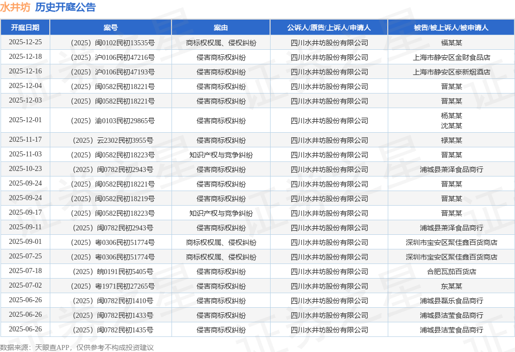 案号:(2025)沪0106民初47216号根据统计,近一年内以四川水井坊股份有限公司为当事人的历史开庭公告有33则,其中案由为“侵害商标权纠纷”的公告以26则居首,其次为“商标权权属、侵权纠纷”有4则,“知识产权与竞争纠纷”有2则。历史开庭公告(前20条)如下: