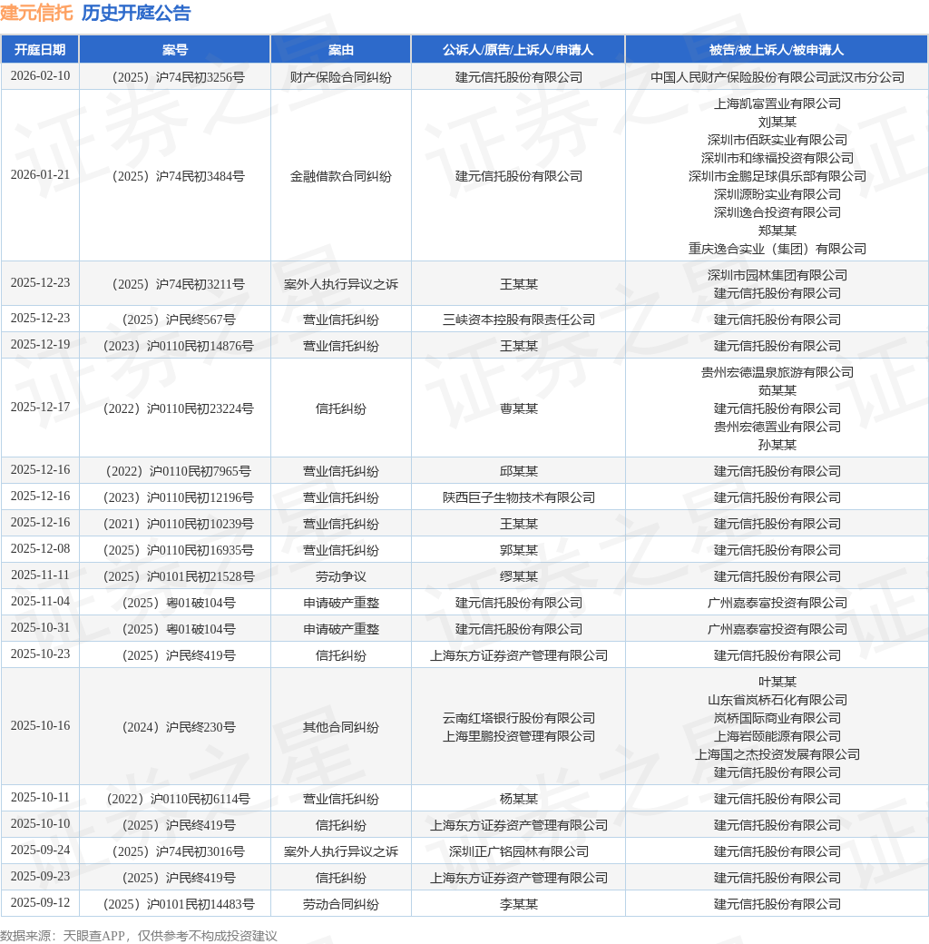 案号:(2023)沪0110民初14876号根据统计,近一年内以建元信托股份有限公司为当事人的历史开庭公告有30则,其中案由为“营业信托纠纷”的公告以9则居首,其次为“信托纠纷”有4则,“申请破产重整”有4则。历史开庭公告(前20条)如下: