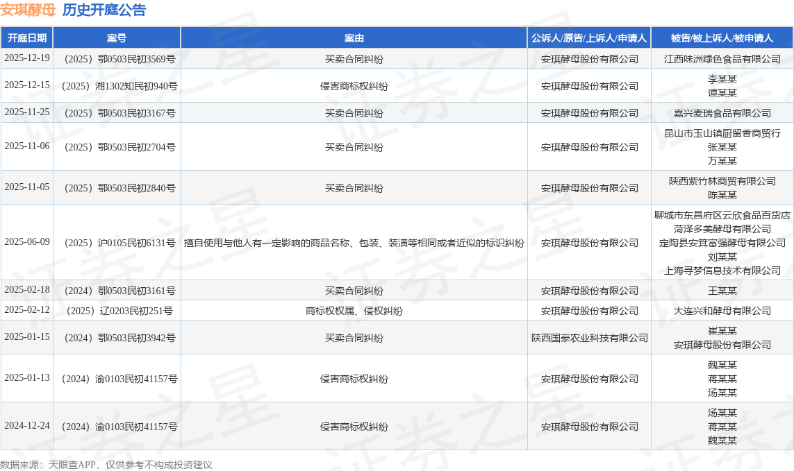 案号:(2025)鄂0503民初3569号根据统计,近一年内以安琪酵母股份有限公司为当事人的历史开庭公告有11则,其中案由为“买卖合同纠纷”的公告以6则居首,其次为“侵害商标权纠纷”有3则,“商标权权属、侵权纠纷”有1则。历史开庭公告如下: