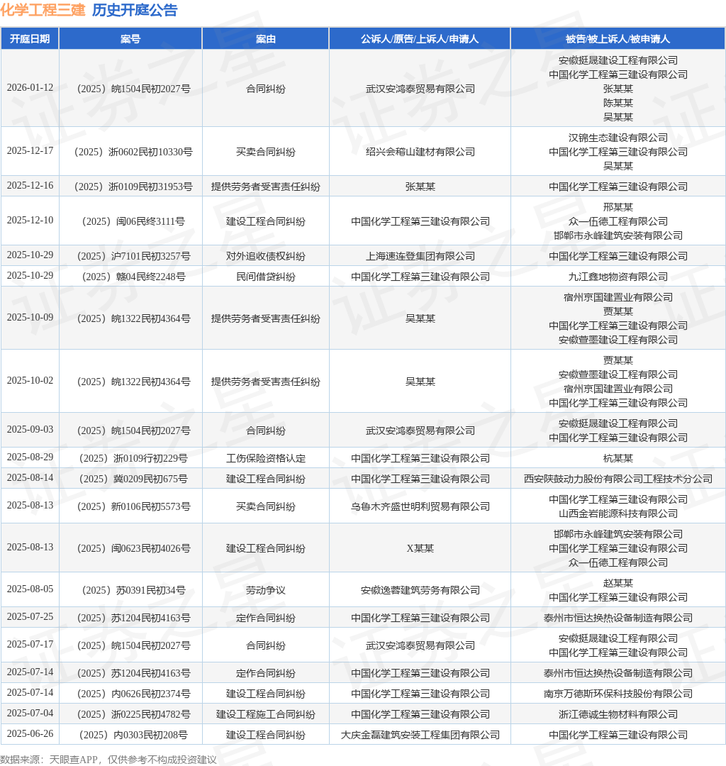 案号:(2025)浙0602民初10330号根据统计,近一年内以中国化学工程第三建设有限公司为当事人的历史开庭公告有52则,其中案由为“建设工程合同纠纷”的公告以11则居首,其次为“劳动争议”有7则,“建设工程施工合同纠纷”有7则。历史开庭公告(前20条)如下: