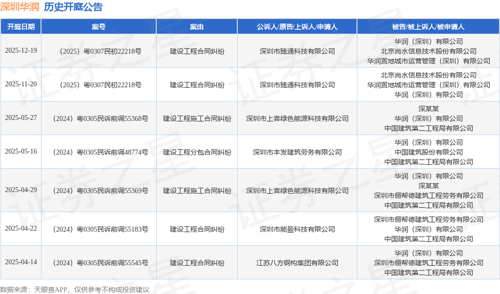 案号:(2025)粤0307民初22218号根据统计,近一年内以华润(深圳)有限公司为当事人的历史开庭公告有7则,其中案由为“建设工程合同纠纷”的公告以4则居首,其次为“建设工程施工合同纠纷”有2则,“建设工程分包合同纠纷”有1则。历史开庭公告如下: