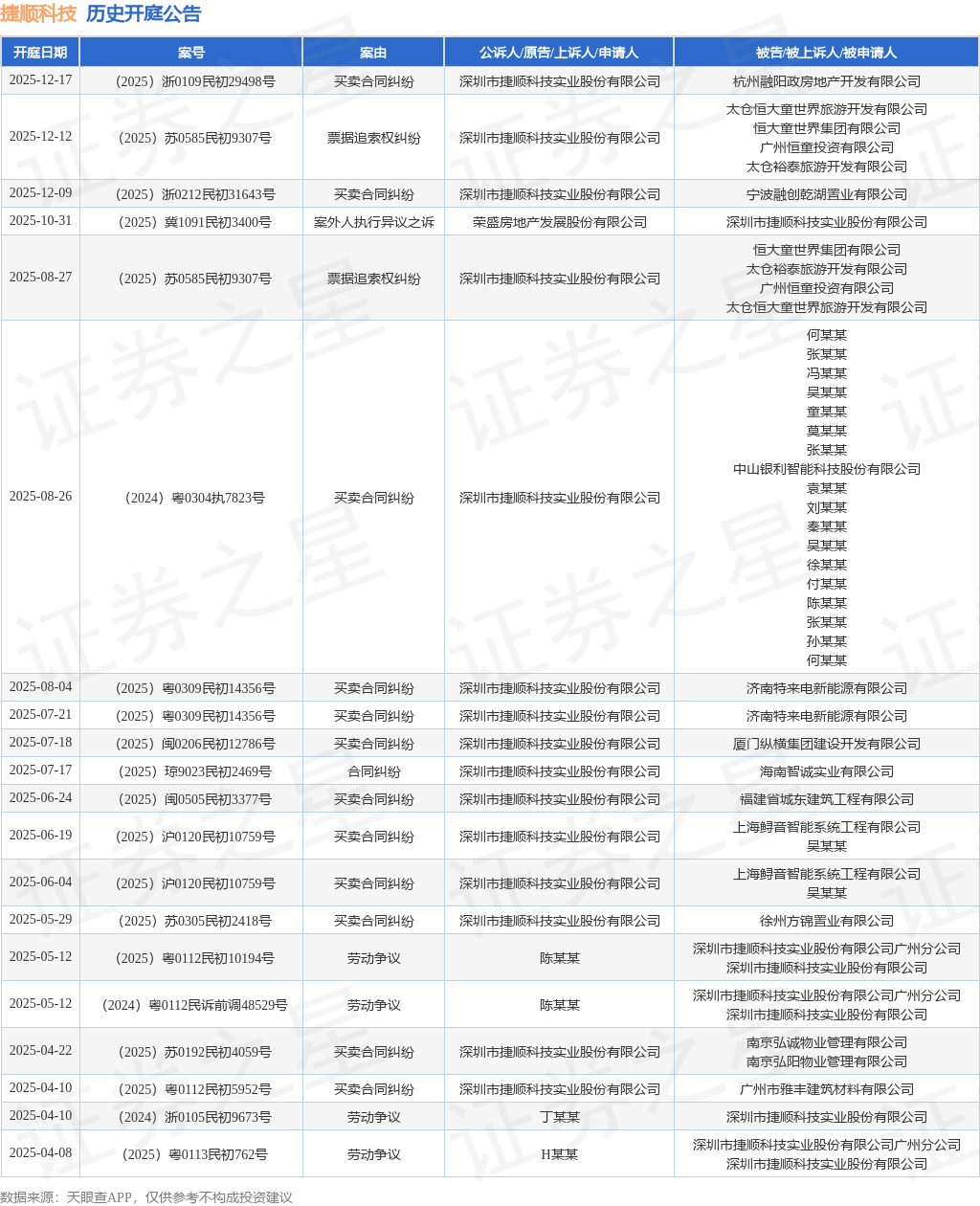 案号:(2025)浙0109民初29498号根据统计,近一年内以深圳市捷顺科技实业股份有限公司为当事人的历史开庭公告有36则,其中案由为“买卖合同纠纷”的公告以23则居首,其次为“劳动争议”有6则,“合同纠纷”有3则。历史开庭公告(前20条)如下: