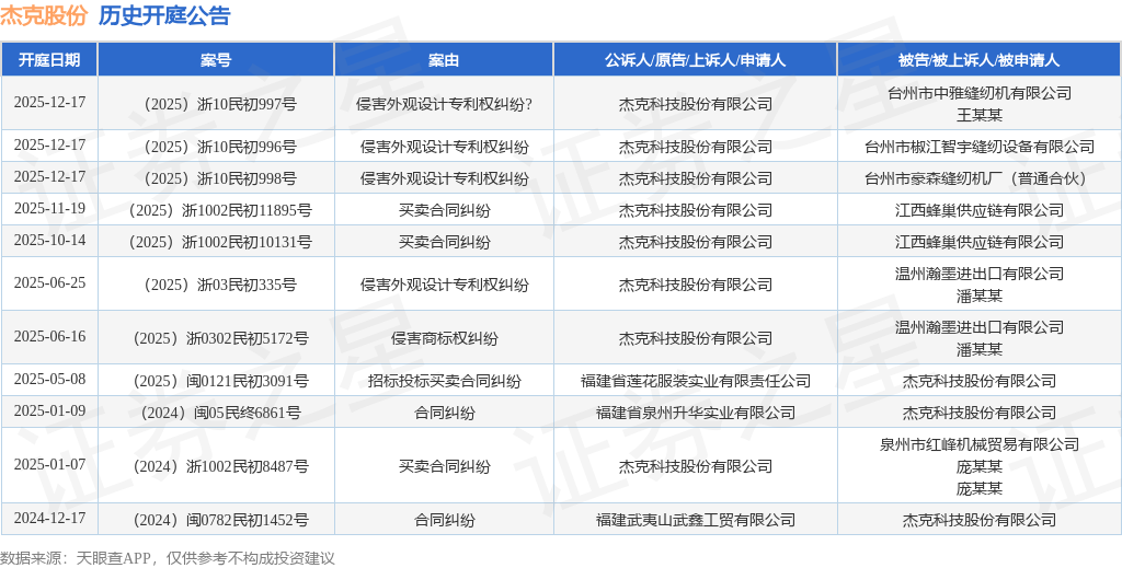 根据统计,近一年内以杰克科技股份有限公司为当事人的历史开庭公告有11则,其中案由为“买卖合同纠纷”的公告以3则居首,其次为“侵害外观设计专利权纠纷”有3则,“合同纠纷”有2则。历史开庭公告如下: