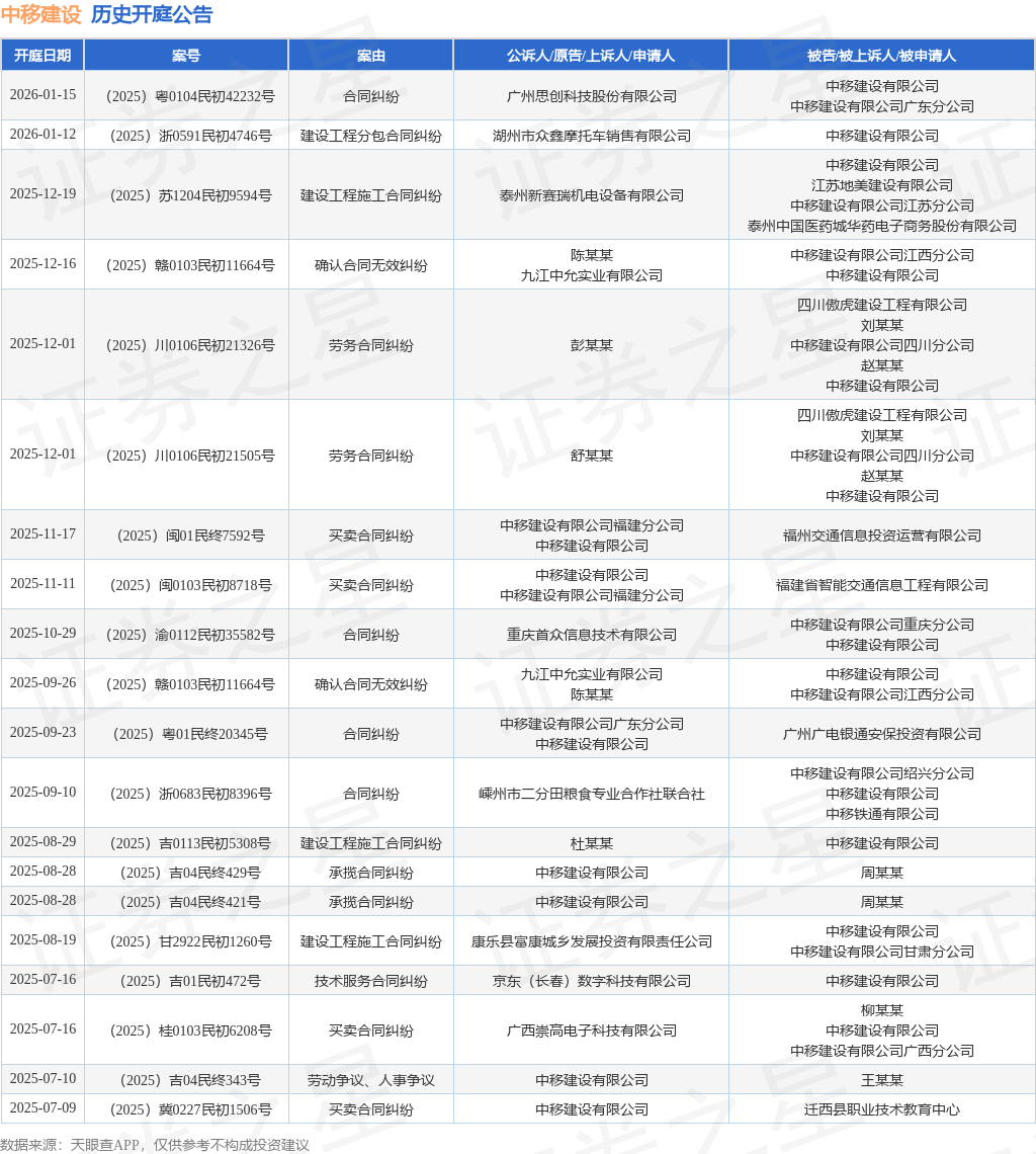 案号:(2025)苏1204民初9594号根据统计,近一年内以中移建设有限公司为当事人的历史开庭公告有66则,其中案由为“建设工程施工合同纠纷”的公告以15则居首,其次为“买卖合同纠纷”有13则,“劳务合同纠纷”有6则。历史开庭公告(前20条)如下: