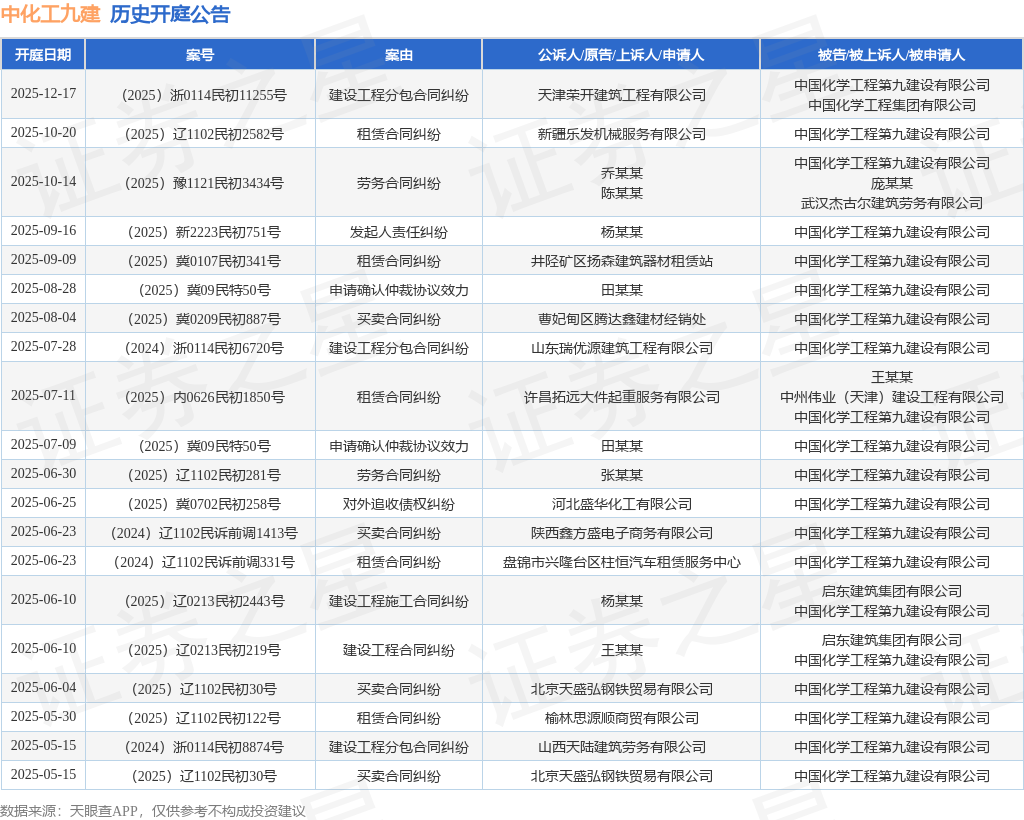 案号:(2025)浙0114民初11255号根据统计,近一年内以中国化学工程第九建设有限公司为当事人的历史开庭公告有65则,其中案由为“劳务合同纠纷”的公告以17则居首,其次为“买卖合同纠纷”有16则,“租赁合同纠纷”有9则。历史开庭公告(前20条)如下: