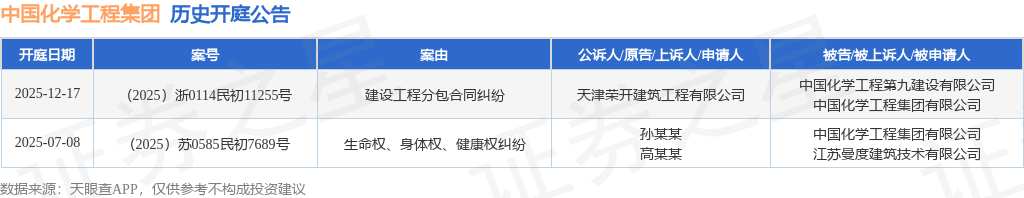 案号:(2025)浙0114民初11255号根据统计,近一年内以中国化学工程集团有限公司为当事人的历史开庭公告有2则,其中案由为“建设工程分包合同纠纷”的公告以1则居首,其次为“生命权、身体权、健康权纠纷”有1则。历史开庭公告如下: