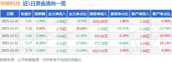 证券之星消息,截至2025年12月16日收盘,华映科技(000536)报收于5.41元,下跌1.99%,换手率14.45%,成交量399.29万手,成交额22.59亿元。