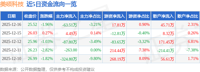 证券之星消息,截至2025年12月16日收盘,美硕科技(301295)报收于25.52元,下跌1.96%,换手率2.64%,成交量7747.0手,成交额1979.17万元。