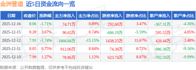 证券之星消息,截至2025年12月16日收盘,金洲管道(002443)报收于8.06元,下跌1.71%,换手率1.99%,成交量10.36万手,成交额8424.78万元。