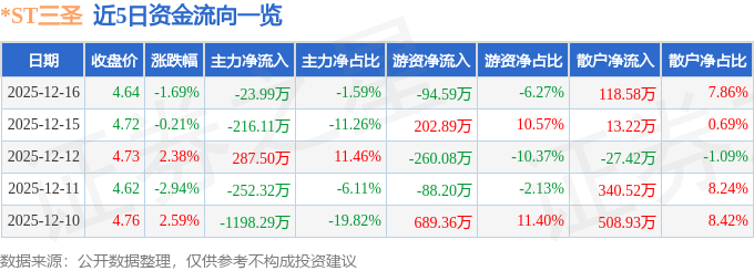 证券之星消息,截至2025年12月16日收盘,*ST三圣(002742)报收于4.64元,下跌1.69%,换手率0.62%,成交量3.24万手,成交额1507.72万元。
