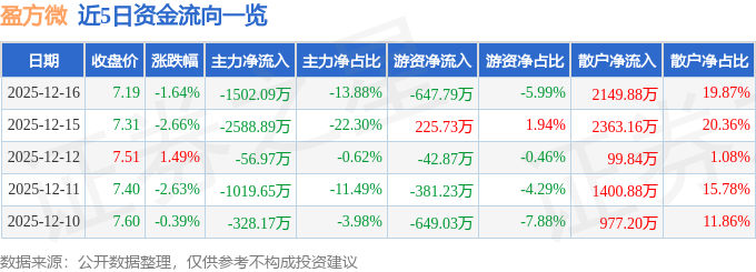证券之星消息,截至2025年12月16日收盘,盈方微(000670)报收于7.19元,下跌1.64%,换手率1.82%,成交量14.98万手,成交额1.08亿元。