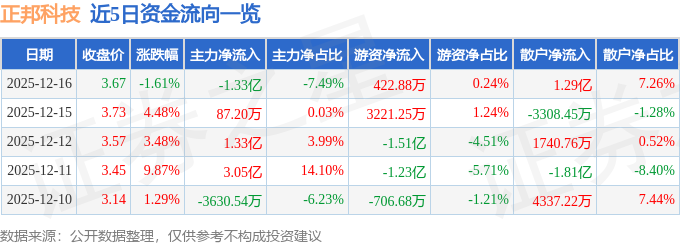 证券之星消息,截至2025年12月16日收盘,正邦科技(002157)报收于3.67元,下跌1.61%,换手率6.65%,成交量480.36万手,成交额17.73亿元。