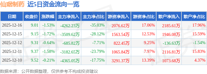 证券之星消息,截至2025年12月16日收盘,仙琚制药(002332)报收于9.01元,下跌1.53%,换手率1.37%,成交量13.44万手,成交额1.22亿元。