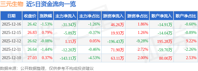 证券之星消息,截至2025年12月16日收盘,三元生物(301206)报收于26.42元,下跌1.53%,换手率0.72%,成交量9356.0手,成交额2481.5万元。