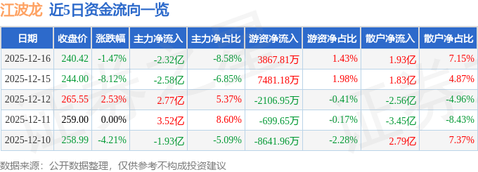 证券之星消息,截至2025年12月16日收盘,江波龙(301308)报收于240.42元,下跌1.47%,换手率4.02%,成交量11.04万手,成交额27.01亿元。