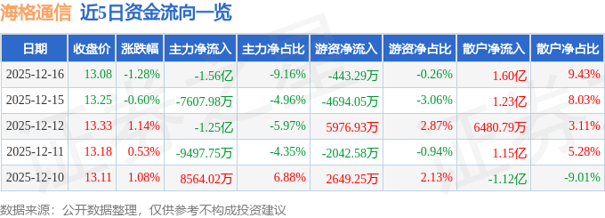证券之星消息,截至2025年12月16日收盘,海格通信(002465)报收于13.08元,下跌1.28%,换手率5.29%,成交量131.04万手,成交额16.97亿元。