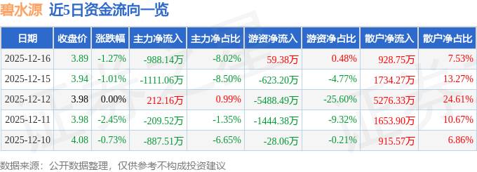 证券之星消息,截至2025年12月16日收盘,碧水源(300070)报收于3.89元,下跌1.27%,换手率0.94%,成交量31.69万手,成交额1.23亿元。