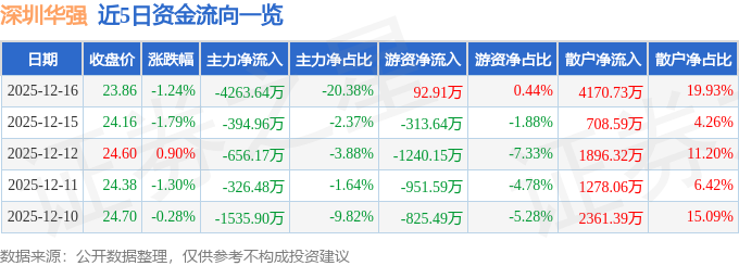 证券之星消息,截至2025年12月16日收盘,深圳华强(000062)报收于23.86元,下跌1.24%,换手率0.84%,成交量8.79万手,成交额2.09亿元。