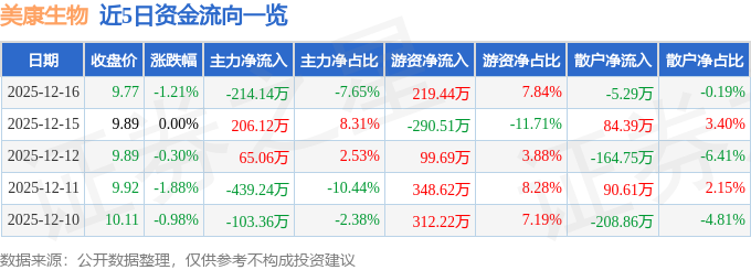 证券之星消息,截至2025年12月16日收盘,美康生物(300439)报收于9.77元,下跌1.21%,换手率0.98%,成交量2.86万手,成交额2798.89万元。