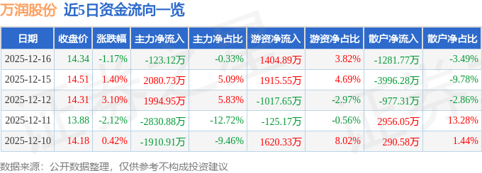 证券之星消息,截至2025年12月16日收盘,万润股份(002643)报收于14.34元,下跌1.17%,换手率2.84%,成交量25.79万手,成交额3.68亿元。