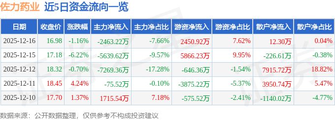 证券之星消息,截至2025年12月16日收盘,佐力药业(300181)报收于16.98元,下跌1.16%,换手率3.15%,成交量19.02万手,成交额3.22亿元。