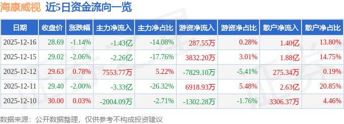 证券之星消息,截至2025年12月16日收盘,海康威视(002415)报收于28.69元,下跌1.14%,换手率0.39%,成交量35.45万手,成交额10.18亿元。
