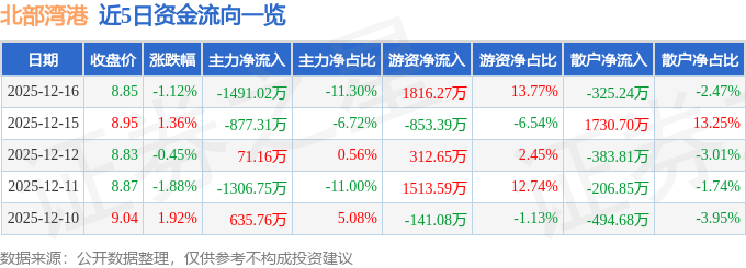 证券之星消息,截至2025年12月16日收盘,北部湾港(000582)报收于8.85元,下跌1.12%,换手率0.74%,成交量14.93万手,成交额1.32亿元。
