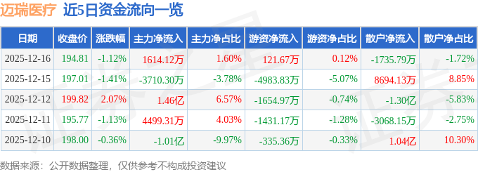 证券之星消息,截至2025年12月16日收盘,迈瑞医疗(300760)报收于194.81元,下跌1.12%,换手率0.42%,成交量5.15万手,成交额10.08亿元。
